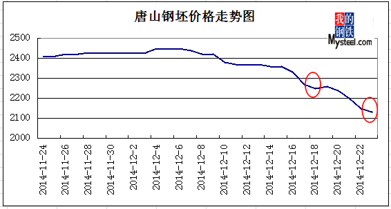 上图是近1个月以来的唐山钢坯价格走势图。从上图可以看出唐山钢坯价格从12月7日开始了下跌之旅,16日价格开始加速下滑,一直持续到18日,但18日下滑幅度有所止住,19日价格便打破下跌格局小幅上扬,见上图第一个红色圆圈处。接下来从21日起,钢坯价格继续加速下滑,一直持续到今日,但是今日下滑幅度有所减缓,就如18日一般,见上图第二个红色圆圈处。笔者认为,这是一个止跌的信号,并且往往暴跌之后必有反弹,19日第一波反弹失败,那么接下来的反弹成功率应该是增大的。从这点来看,钢坯价格或许能缓住一口气。