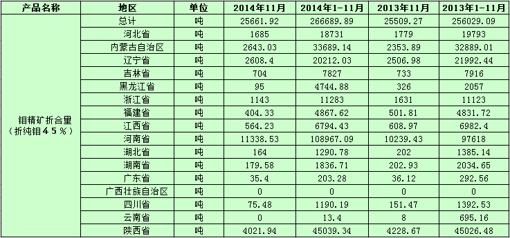 据数据显示:2014年11月份国内钼精矿总产量25661.92吨(折纯钼45%),较去年11月份总产量25509.27吨,同比增长0.6%;较今年10月份总产量25730.98吨,环比减少0.3%;2014年1-11月累计生产钼精矿总产量266689.89吨,较去年1-11月总产量256029.09吨,同比增长4.2%。