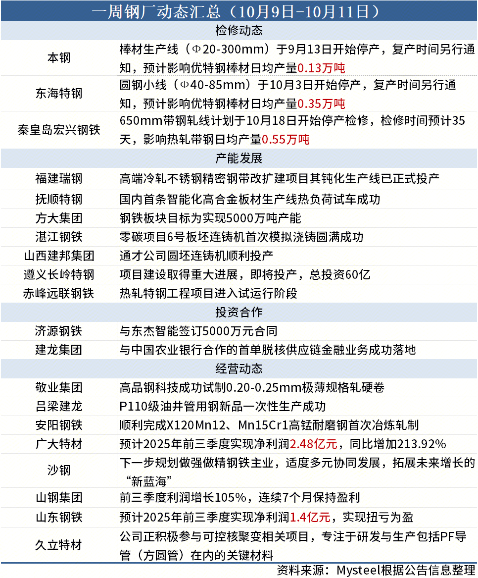 不完全统计,本周(10月9日-10月11日)3家钢厂发布检修信息,具体如下: