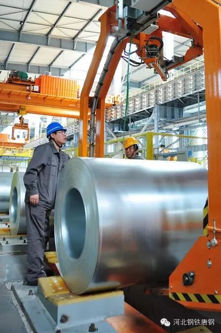 唐钢冷轧部高强汽车板镀锌线职工检查刚下线的产品质量