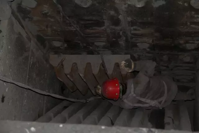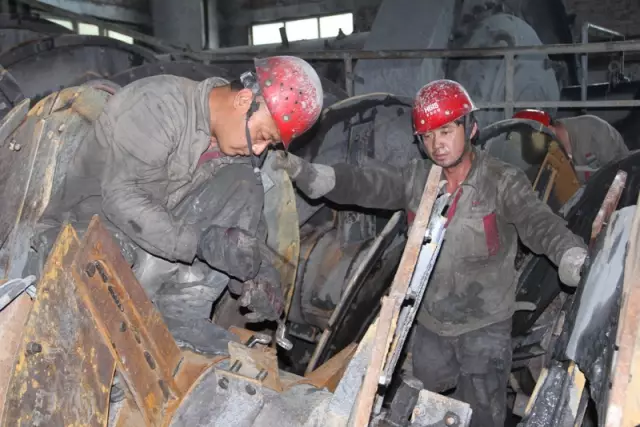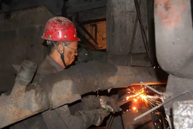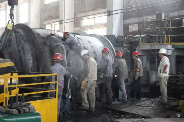 在闷热的球磨机滚筒内职工更换衬板螺丝