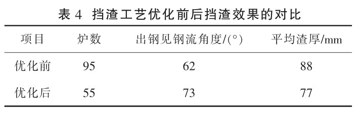 挡渣工艺优化后, 减少了出钢初期进入钢包内部的炉渣,并减少了出钢末期的带渣量。 挡渣工艺优化前后挡渣效果的对比见表 4 所示。 由表 4看出,出钢见钢流角度由 62° 提高至 73° ,炉渣平均厚度由 88 mm 降低至 77 mm 。