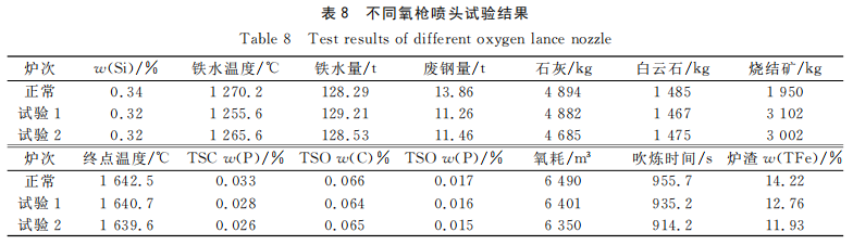 通过对比试验发现,旋流氧枪喷头过程化渣效果较好,TSC、TSO 磷含量、氧气 消耗、炉渣 全铁等关键指标均有不同程度下降,吹炼时间有所缩短。具体试验结果见表8。